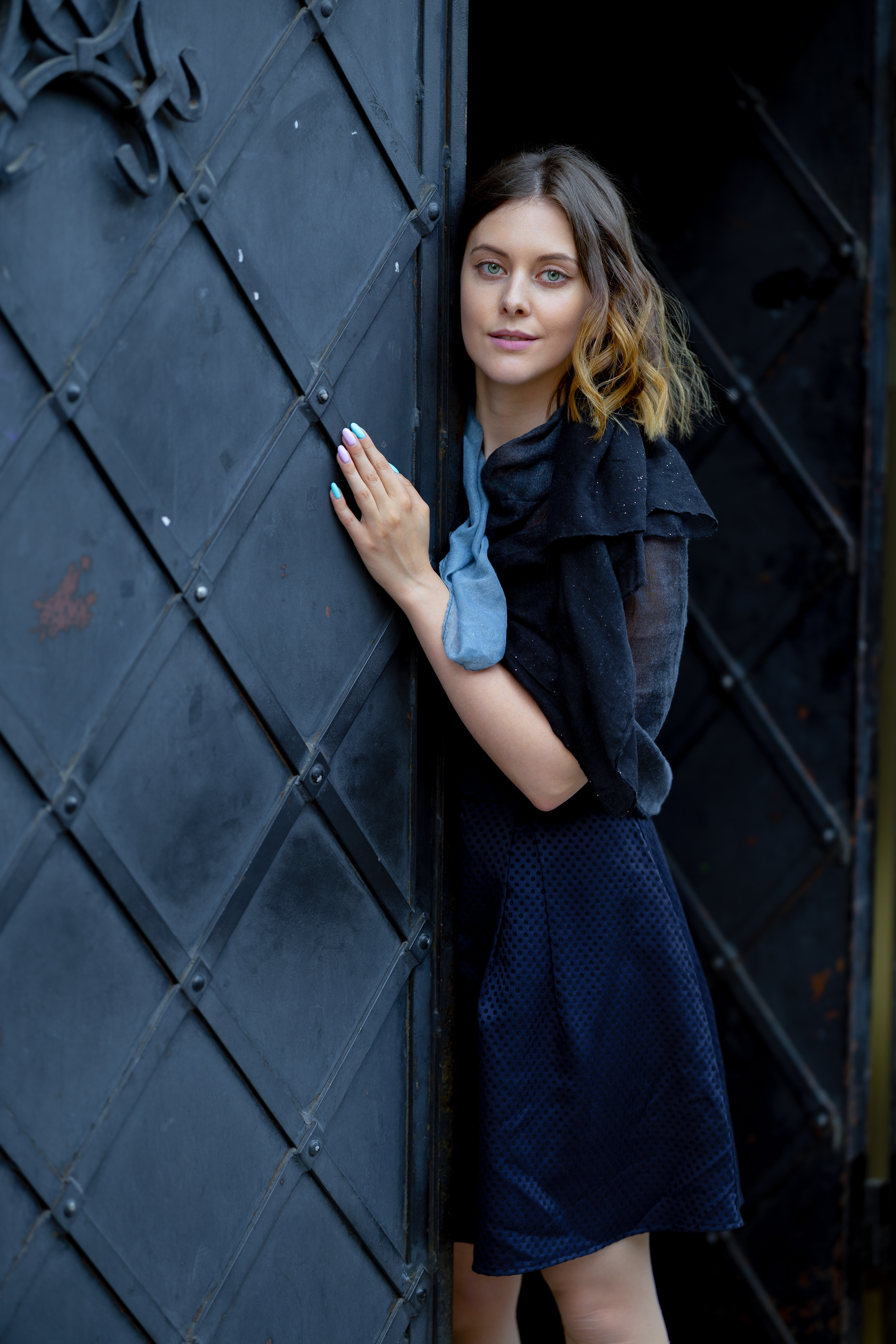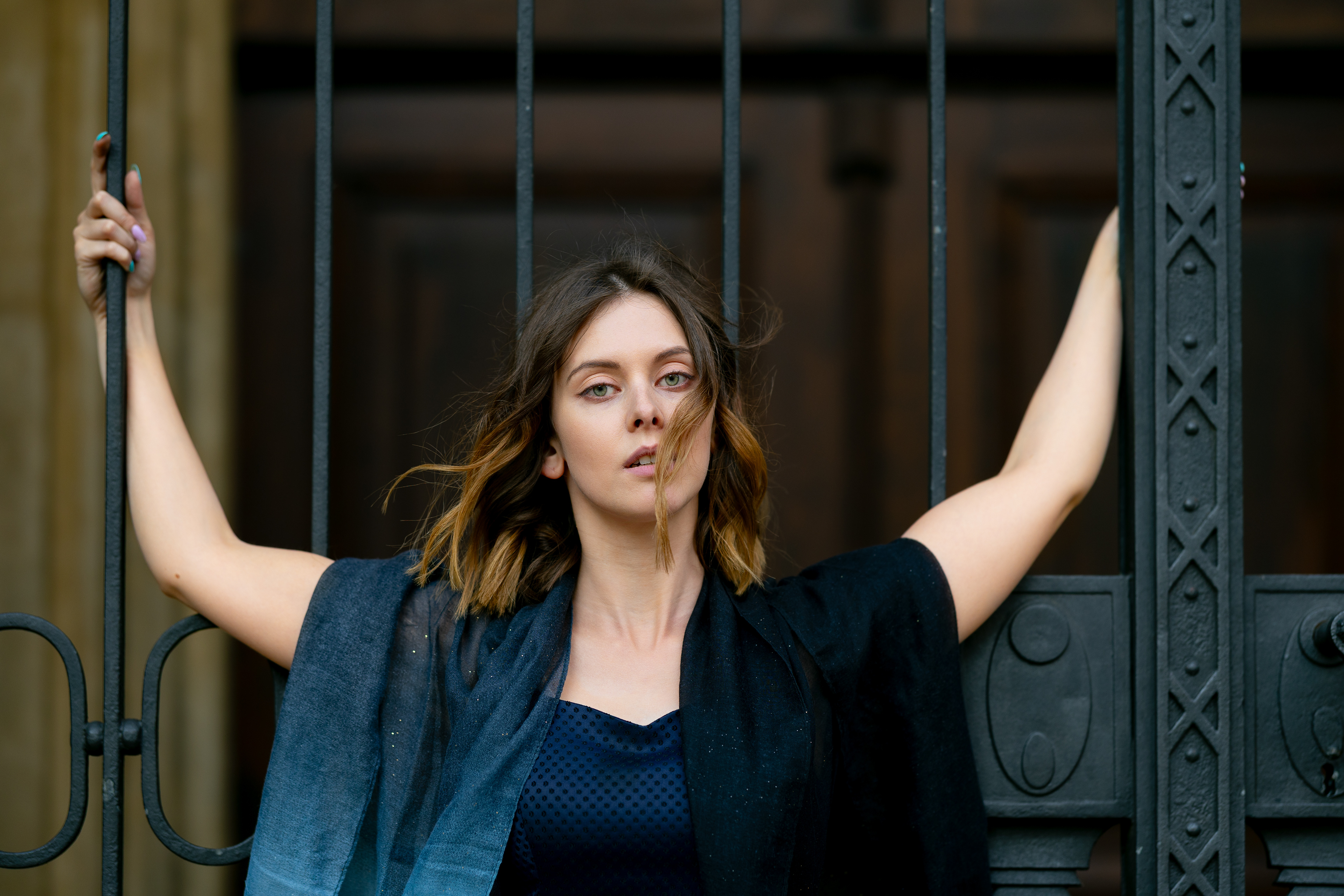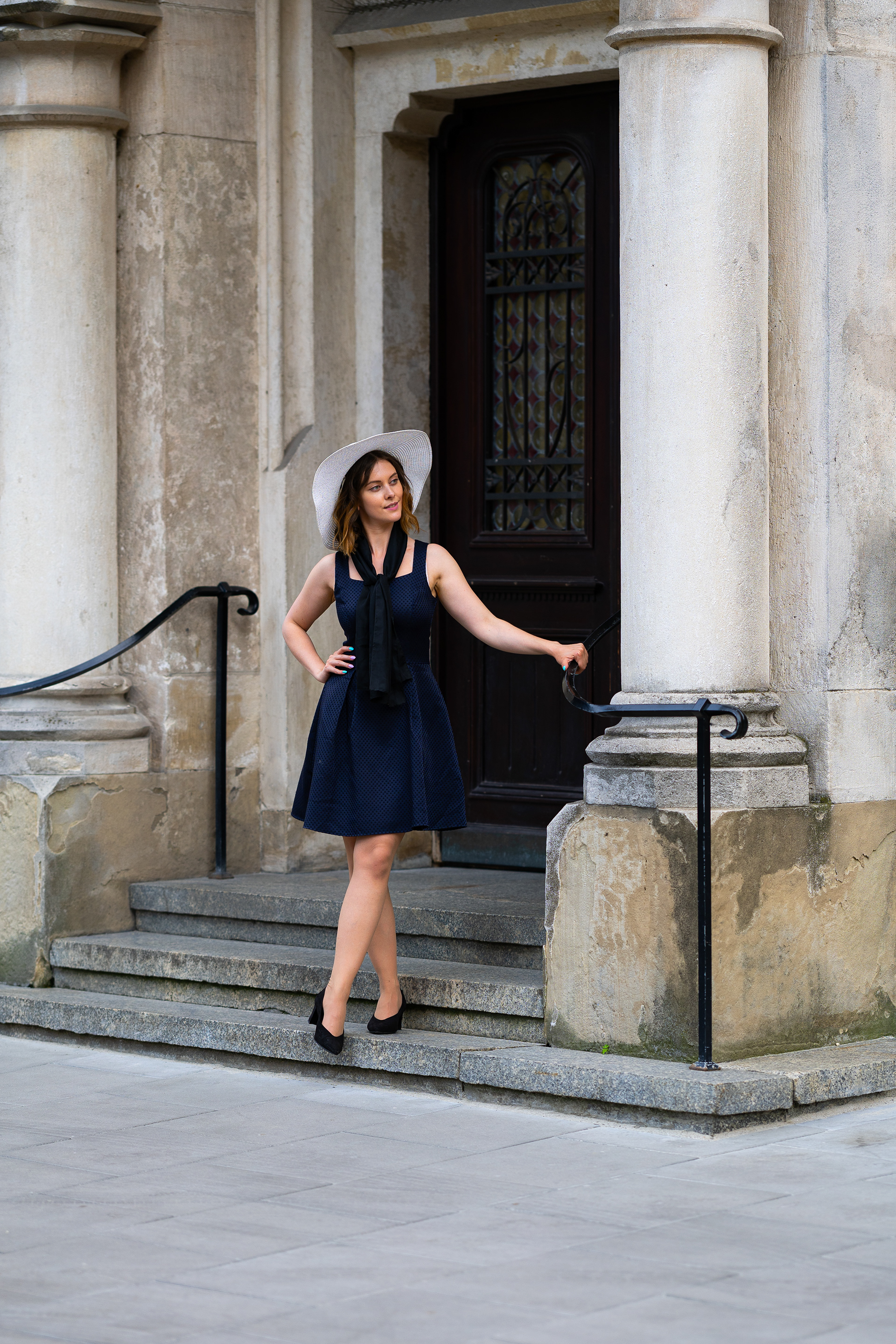 Przy ul. Krakowskiej zatrzymaliśmy się przy pięknej, kutej, żelaznej bramie prowadzącej na kościelne schody. Jest w niej coś surowego i minimalistycznego — czarna krata nadaje przestrzeni nutę tajemniczości, wręcz lekko mrocznego klimatu, który świetnie kontrastuje z subtelnością portretów Pauliny. Kiedy opierała się o bramę, miejsce wyglądało jak gotowa scenografia do klimatycznego filmu; żelazo i mury tworzyły pełną napięcia atmosferę, z odrobiną tajemnicy i dreszczem retro nastroju. To miejsce, gdzie jako fotograf portretowy w Krakowie zawsze znajduję coś wyjątkowego – nie tylko tło, ale i cały nastrój zdjęcia.