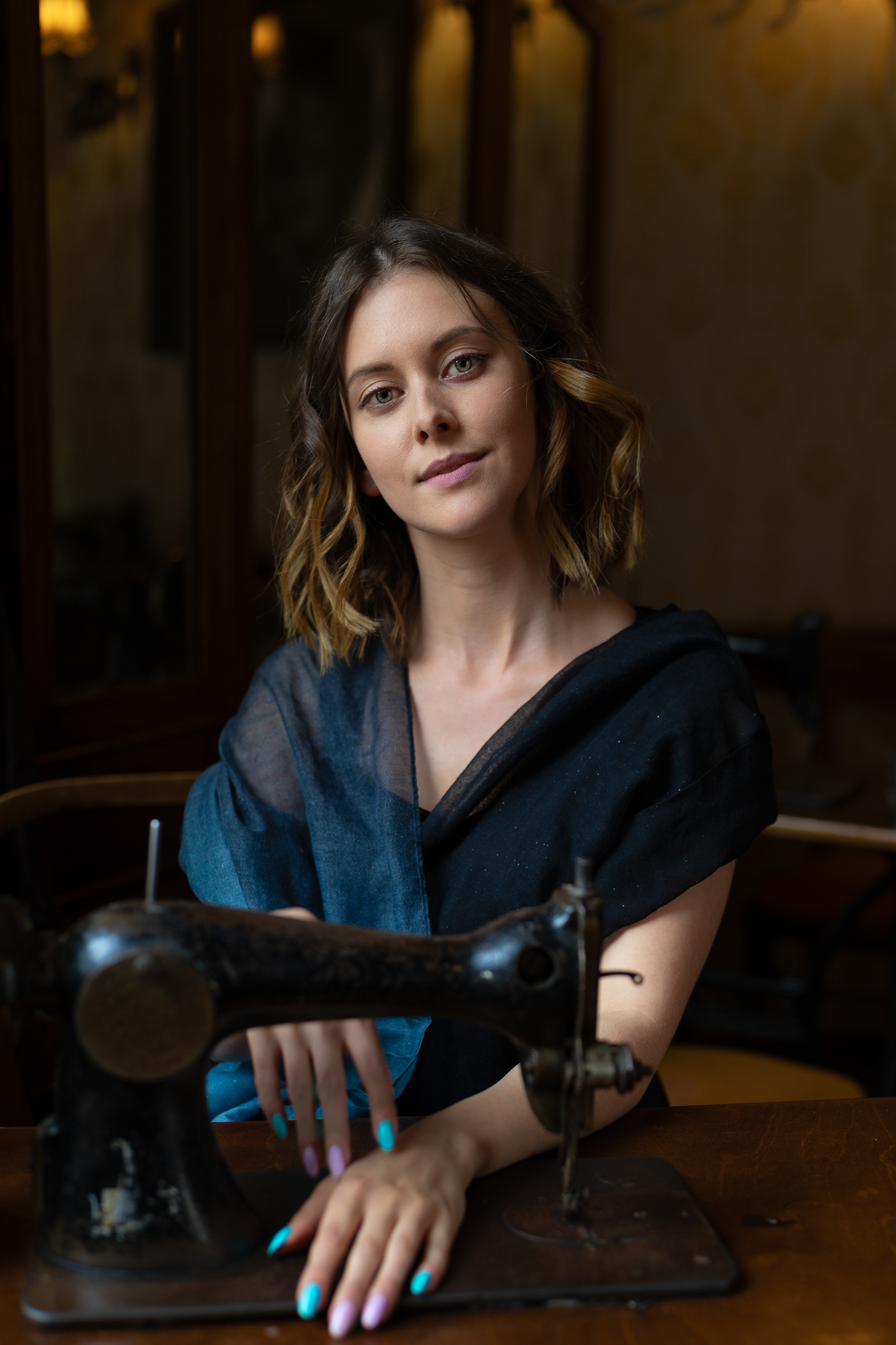 Pierwsze kadry powstały w legendarnej kawiarni Singer, tuż na rogu Izaaka i Estery. To miejsce mnie niezmiennie zachwyca — pełne starych maszyn do szycia, ciepłego światła i gwaru rozmów. Malutka sala, każdy kąt ma tu własny charakter, a portrety wychodzą wyjątkowo klimatyczne.