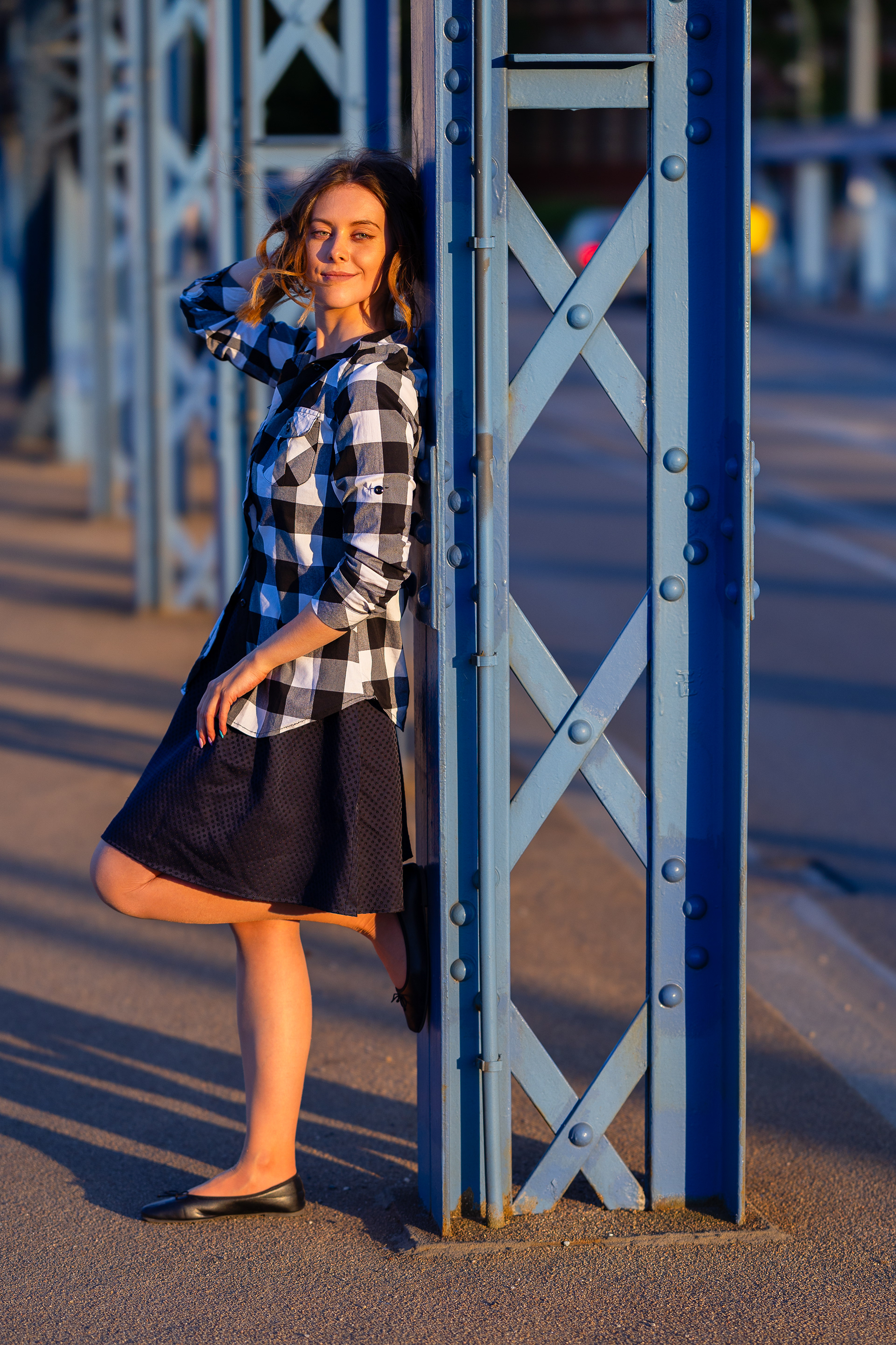 Na finał naszej sesji przenieśliśmy się w okolice mostu Piłsudskiego i mostu Retmańskiego, gdzie złote promienie zachodzącego słońca otuliły nas niezwykłym światłem. To była ta magiczna chwila, kiedy cały Kazimierz nabiera szczególnej energii, a ciepły blask nadaje zdjęciom wyjątkowego nastroju. Stojąc wśród wysokich traw oświetlonych słonecznym światłem, każdy kadr miał w sobie nutę romantyzmu i nostalgii. Paulina świetnie odnajdywała się w tej świetlistej scenerii, a miasto w tle przypominało plan filmowy z odrobiną letniego snu. Uwielbiam takie zakończenia sesji — pełne koloru, światła i wyjątkowej atmosfery.